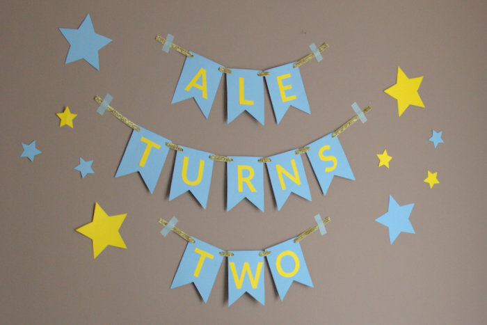 Per il bounting invece mi sono letteralmente innamorata di quelli di London Sparkle Eventdecor e così ho deciso di realizzarlo da sola: cartoncino, bisturi (sì quel taglierino usato apposta per le decorazioni da realizzare con la carta), colla, forbici, scritte e via, mi sono ingegnata a realizzare la scritta ALE TURNS TWO!